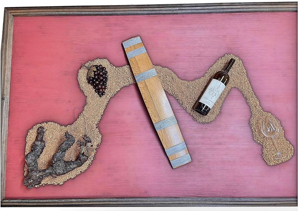 Let’s get in touch. We can talk about any of the items in the gallery, variations on them, something completely new, or the piece below that I have recently started. Its 4 by 6 feet and illustrates five steps in the making and enjoyment of wine. I envision other elements to be includes including a sun, clouds, and hills each in cork all on a field of corks.
